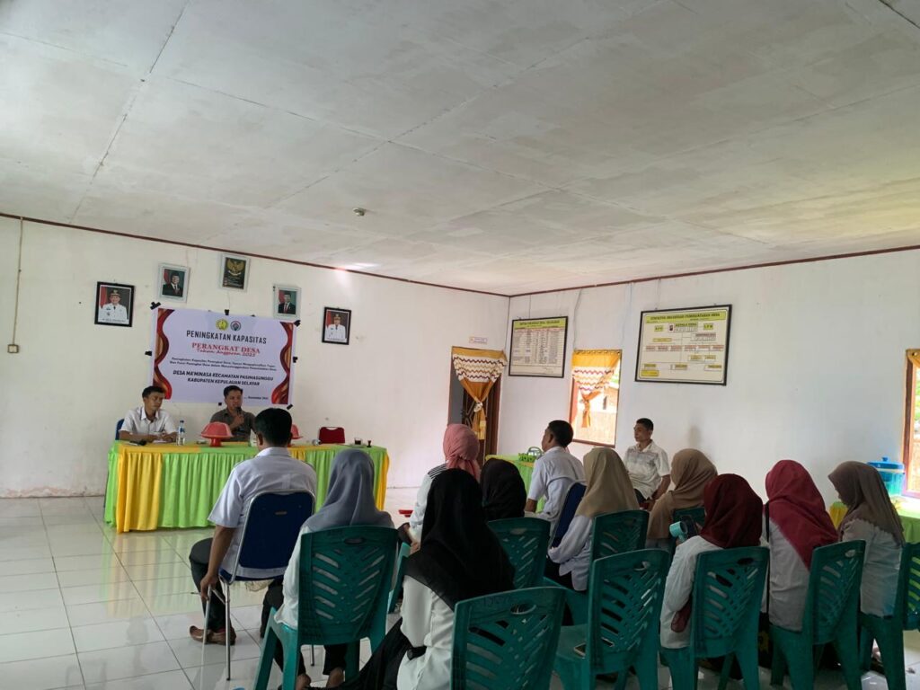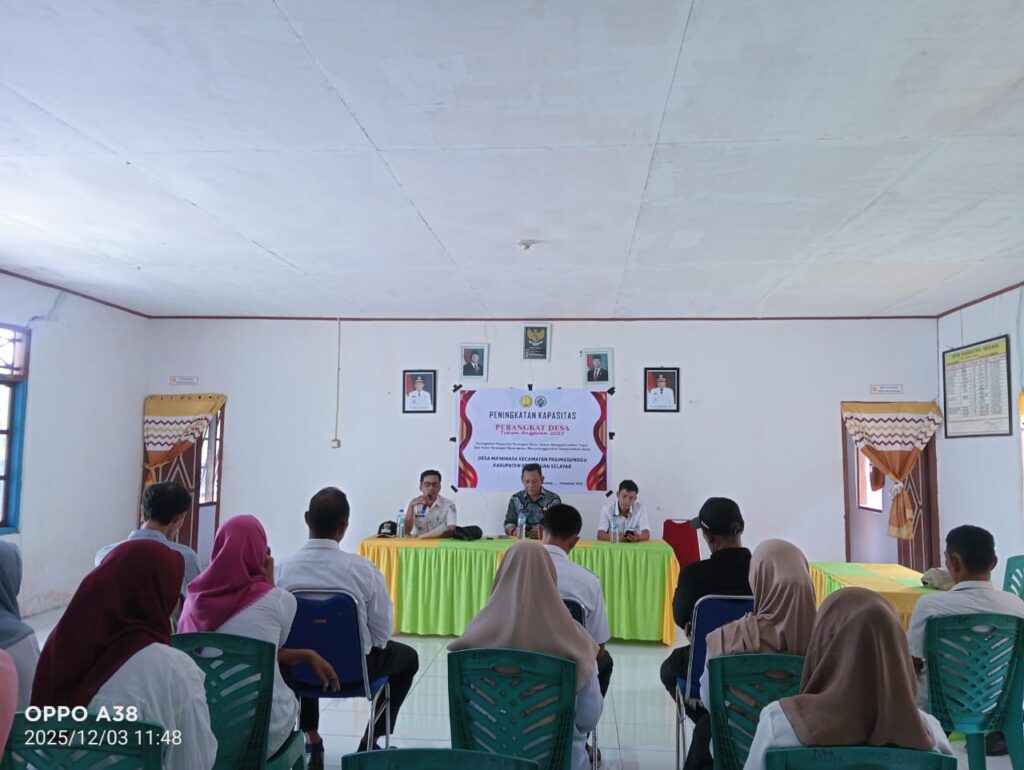 DESA MA’MINASA, KAB. KEPULAUAN SELAYAR — Hari ini, RABU, 03 DESEMBER 2025, bertempat di Aula Kantor Desa, diselenggarakan kegiatan Pelatihan Perangkat Desa . Acara ini dibuka secara resmi oleh Kepala Desa Ma’minasa bapak H. KAMALUDDIN serta CAMAT PASIMASUNGGU bapak NUR AMIN, S.Sos serta Kadis Pemberdayaan Masyarakat dan Desa, Zulfikri, S. STP sebagai narasumber pertama dan Sekertaris Dinas PMD Bapak Muhammad Rusydi, S.H, dihadiri oleh seluruh perangkat desa, anggota BPD.